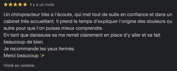 Chaque consultation vise à accélérer votre rétablissement grâce à des techniques manuelles adaptées et des conseils pratiques.